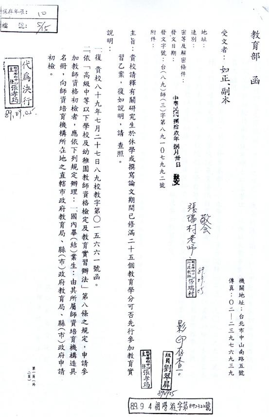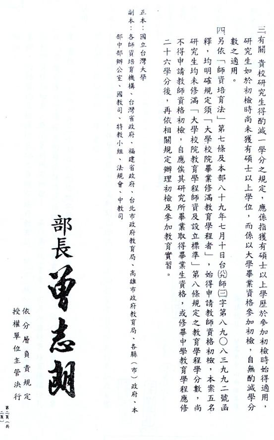 主旨:教育部公佈研究生要取得畢業生資格或是修滿二十六學分才可參加教育實習。