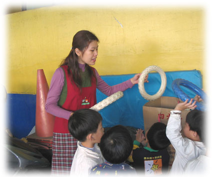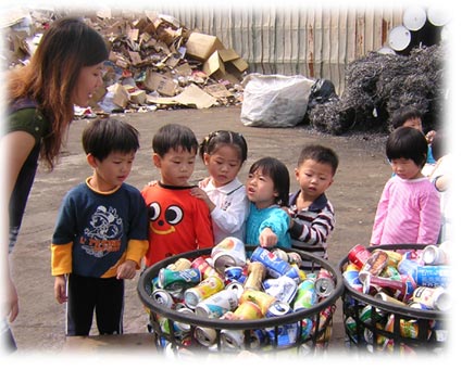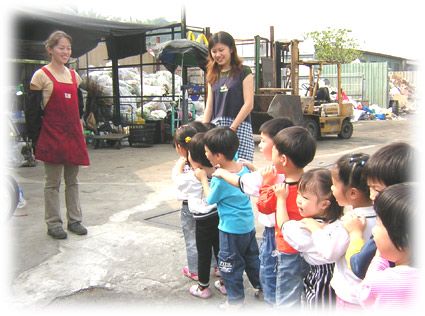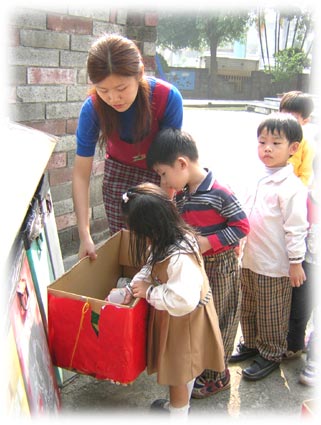 孩子們知道這些資源是可以回收利用的,所以要把這些收集的資源,送到回收桶中。 |