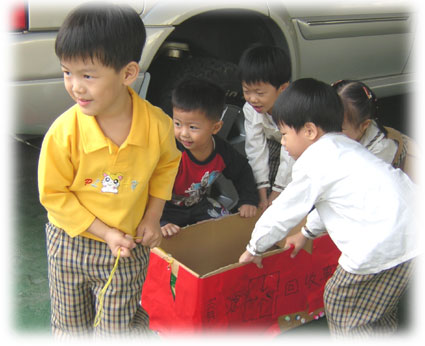 終於我們的資源回收車誕生囉!載著我們所收集的東西,準備送到大門口的資源回收桶中。