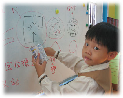 在「小小偵探家」活動裡,孩子除了在學校可以找到這些可再回收利用的資源外,薏棻:「我在家裡有找到很多有回收標誌的東西哦!」