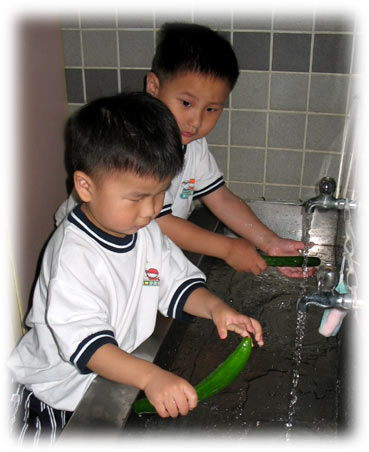 第二天由皓皓、思妤、亮宏、聖筌帶來的蔬菜中選出小黃瓜來做簡單的料理(醃小黃瓜) |