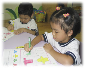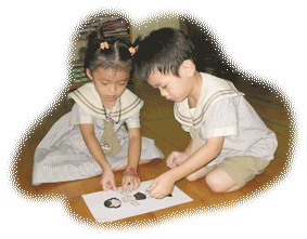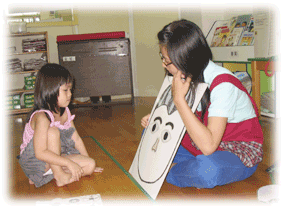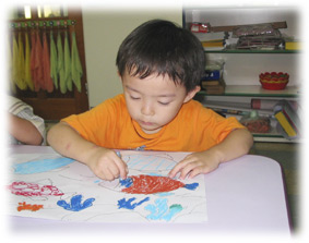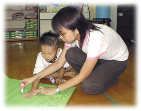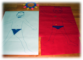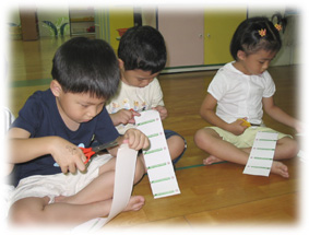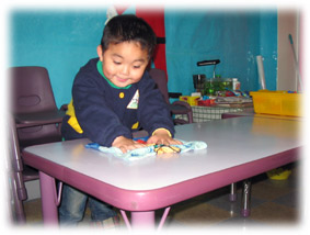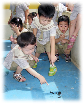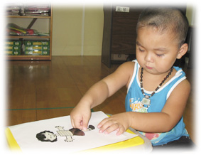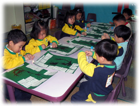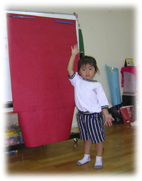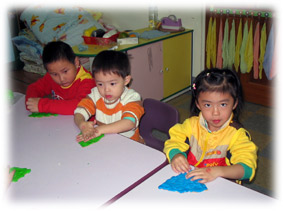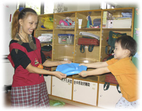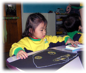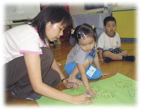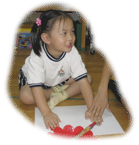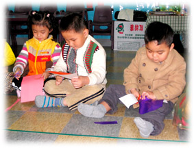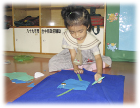 聖誕老公公長什麼模樣呢?孩子利用勞作的方式呈現他們印象中的聖誕老人,因為他們希望真的的聖誕老公公會送禮物給自己喔!大家七嘴八舌的為老公公加上身體、皮帶、腳、鞋子以及雙手。 |