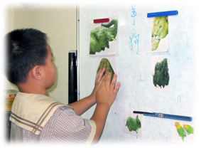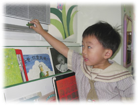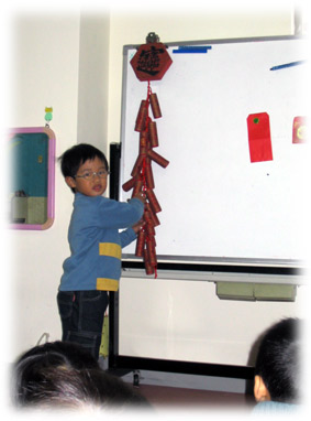 透過小朋友的分享中來認識過年時的相關物品,冠廷說:「過新年要放鞭炮這是假的我不會怕。」