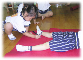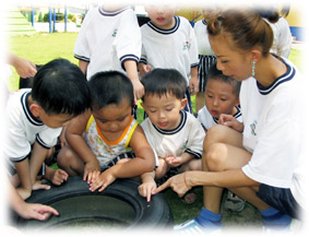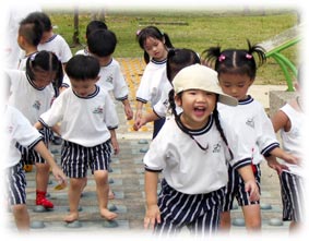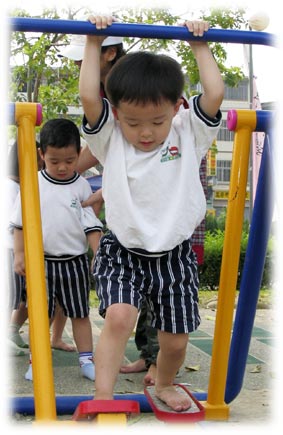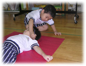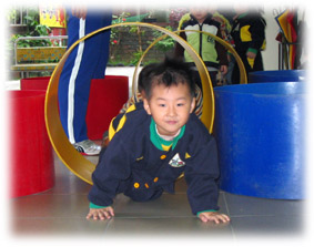 在當天的體能活動∼大輪子,筌筌說:「圓圈圈也很像是在過山洞喔!」 |