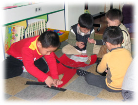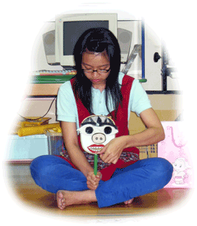 融融說:「給他塗綠色就好了嘛!」於是大家開始在教室裡尋找可以製作的材料,有的塗臉、有的剪紙做鬃毛、有的年五官、有的貼身體大家分工合作共同完成我們的舞獅。 |