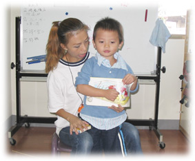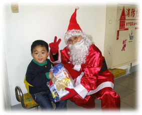 到了12/23下午聖誕老公公真的來送禮了耶!東霖好奇的看著聖誕老公公不停的問說:「你是聖誕老公公嗎?你是聖誕老公公嗎?」 |