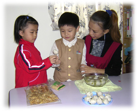 寒冷的冬季裡,有孩子們最期待且感恩、祝福意味濃厚的聖誕節和舊曆年,它將這冬季點綴的熱鬧繽紛。我們在這一次的課程「年獸來了」中分為中國年與西洋年來作探討,因此首先從快樂聖誕節拉開序幕,從孩子們上一個主題「小魚兒」中,最後的活動「好吃的魚丸」引發對「圓」的聯想,並且藉由孩子們對聖誕老公公的期待中進而認識聖誕節與中國年的由來以及相關的習俗活動。 |