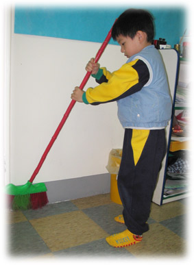 皓皓說:「我想要用掃把幫忙掃一掃地。」