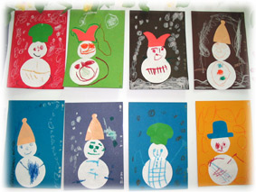 由「圓」的聯想和遊戲中孩子們透過數字積木與圓形圖卡製作出雪人作品。