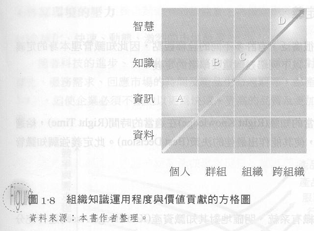 - 知識利用的報酬率遞增:知識是個存在於任何地方、潛力無窮、不會磨損的珍貴資源,組織是無法忽視或漠視它的存在。
