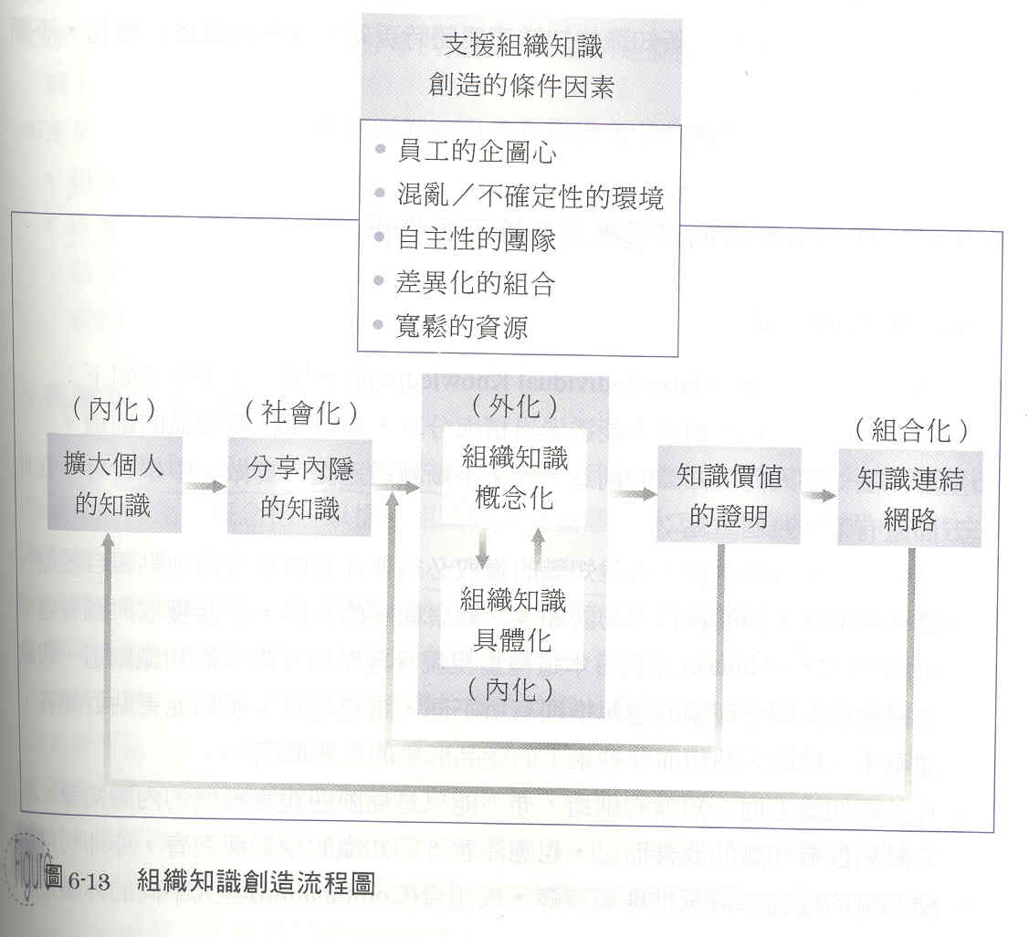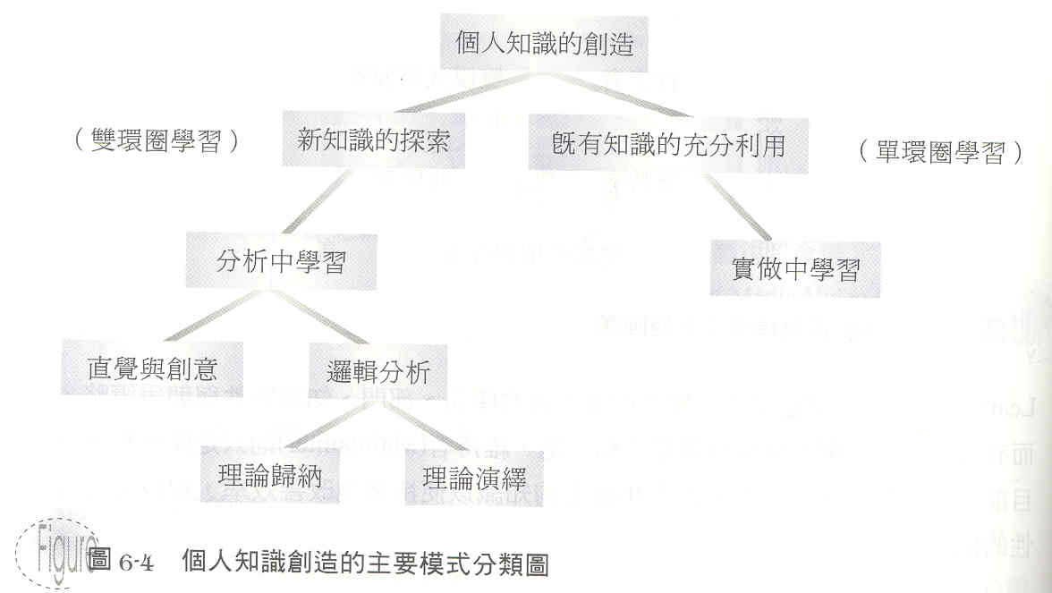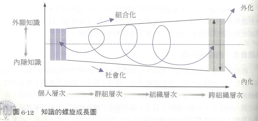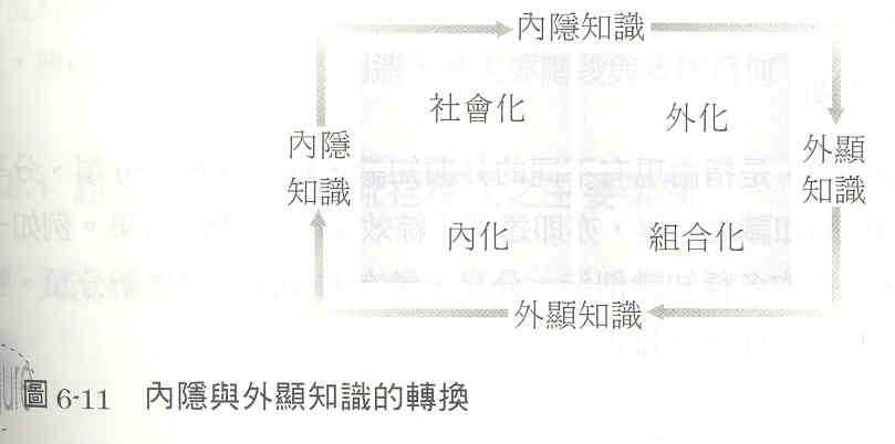 | 知識創造方式與目的 | 個別員工間透過內隱知識的互動來自我超越 | 團隊成員透過討論、辯證來外化內隱的知識並產生共識 | 員工透過不同知識來源的擷取來組合成新知識 | 員工利用實做與實驗來內化知識學習與自我超越 |