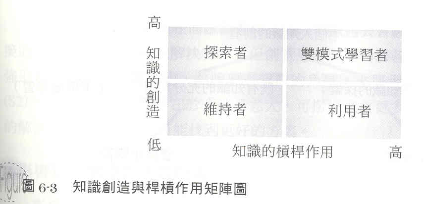 - 雙模式學習者(Bimodel Learner):表示一個組織能根據其內部不同的產品、部門、知識特性與競爭策略,而有效地同時均衡發展兩種策略。