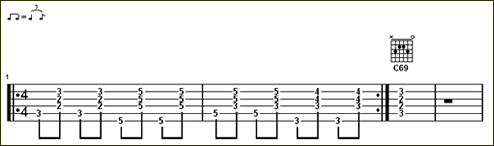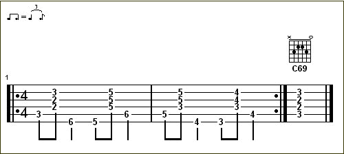 C, Am, Dm, G7。並將和弦稍做延伸 C69, Am7, Dm9, G7+5 如下: