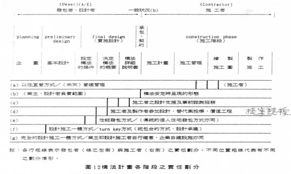 (五)B.O.T. (Build-Operate-Transfer) 即是公部門將單一之建設計劃或設施交由民間興建與經營,於民間經營一段時間後,依特許合約之規定移轉回交給公部門(政府)。原旨意是政府為減輕財政負擔、提升公共工程效率與品質,引進BOT方式,鼓勵民間參與公共建設(『獎參條例』)。例如:臺灣高速鐵路是以BOT興建,土地取得與規劃設計部分由政府辦理,其餘土建工程、軌道車輛的機電設備、車站及系統三十年的營運維修則由民間參與。其他BOT工程如台糖月眉育樂世界、高雄市捷運、東部國道等。 (六)J.V.(Joint Venture,聯合承攬) 係指二家以上之綜合營造業共同承攬同一工程之契約行為,根據共同計算分擔損益之協定,而共同承攬工程。營造業聯合承攬工程時,應共同具名簽約,並檢附聯合承攬協議書,共負工程契約之責。聯合承攬協議書內容如下:1.工作範圍。2.出資比率。3.權利義務。(營造業法) 需採用聯合承攬之工程多是艱巨龐大,乃藉由多種專長之營造業結合及技術移轉協定,除增加工程承接之機會,並有助於各成員技術與管理能力之提升;又此類工程之工期動輒數年,須投入之資源龐大,除工程風險外,尚有社會、政治、經濟、市場等變化風險,可藉由參與聯合承攬工程以分攤風險。 (七)營建管理 (八)營建自動化 (九)營建工程體制