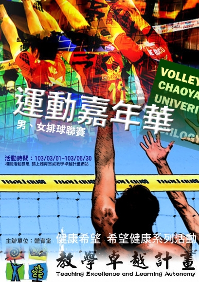 活動名稱 : 運動嘉年華 - 系際 盃 男 子、女子排球聯賽 活動宗旨 : 為提升校園運動風氣;促進系際運動交流;增進師、生體適能能力;提升排球運動技術水準;培養團體合作精神,特舉辦本比賽。 (一)主辦單位:朝陽科技大學體育室 (二)承辦單位 :朝陽科技大學 男 子、女子排球隊 報名事項 (一)報名日期:即日起至民國 103 年 2 月 27 號 (二)報名人數:各系師生採現場報名制(學生須出示學生證);每場比賽需登記滿 12 名球員才得出賽。 (三)報名方式:請列印體育室提供之報名表格式,詳細填入各項資料,並請系主任簽章,於報名期間內將報名表繳交至體育室,始完成報名手續。(如未詳細填妥資料或未附系主任簽章者,視同未完成報名手續,則該系不得參賽。) (四)領隊會議: 民國 103 年 3 月 6 號中午 12 點 30 分於體育館二樓召開。 比賽地點 : 朝陽科技大學室外排球場。 參加單位 : 朝陽科技大學各系 師生 ( 教師以專任教師為限 ) 均可報名參 加。 獎勵辦法 : 各組取前四名頒發獎盃及獎金。
