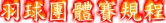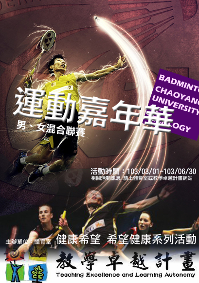 一、活動名稱: 運動嘉年華—系際盃團體羽球聯賽。 二、宗旨: 促進各系及師生之交流與情誼,推廣羽球運動風氣,並提升羽球技術水準,特舉辦本比賽。 三、 主辦單位 :朝陽科技大學體育室 四、 承辦單位 :羽球校代表隊 五、參賽對象: 朝陽科技大學在校生及專任教職員。 六、報名事項: (一)報名日期:即日起至民國103年2月27號 (二)參賽人數:每場次上場人數至少6人(3男3女)學生需出示學生證。 (三)報名方式:請列印體育室提供之報名表格式,詳細填入各項資料,並請系主任簽章,於報名期間內將報名表繳交至體育室,始完成報名手續。(如未詳細填妥資料或未附系主任簽章者視同未完成報名手續,則該系不得參賽) 七、比賽日期 :另行公布,以不影響學生課業為原則(如星期二、四晚上6點)。 八、比賽地點 :朝陽科大體育館羽球場。 九、獎勵辦法: 取前四名頒發獎盃及獎金。 十、比賽規則: (一) 比賽制度 採 循環賽制或單淘汰賽制(依報名隊伍決定賽制)。 1. 分組循環賽:共三點,女雙、混雙、男雙 。 2. 各點比賽採一局 21 分加分新制, 11 分雙方互換場區, 20 比 20 平分時,連續得 2 分為勝方,最多加分至 30 分。 (二)出賽球員須攜帶學生證,以便查驗。 (三)本競賽除特別規定外,均採用中華民國羽球協會審定之最新規則。 (四)比賽進行中如有不服從裁判之判決時,得由領隊或隊長以書面於賽後三十分內向大會提出申訴,由大會審判委員會判定之,其判決即為終決。比賽現場一律不接受口頭抗議。 十一、球隊(員)須知 各隊在規定比賽時間前十五分鐘至記錄台領取比賽記錄單,填妥後即提交大會,至比賽期間仍未提出名單出場比賽以棄權論,如比賽時間有更動,以大會報告為準。 下場比賽之球員請著運動服裝和球鞋,勿穿牛仔褲、皮鞋等衣物,違者裁判得請其更換,不服從裁判得已沒收比賽。 請自備球拍(球由大會供應)。 比賽前應將學生證備妥,俾便核驗。