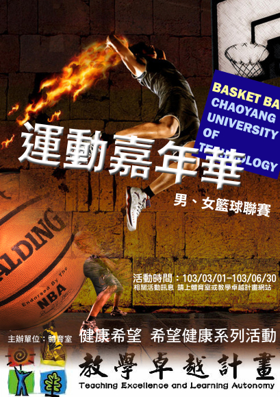 活動宗旨 :為提升校園運動風氣;促進系際運動交流;增進師、生體適能能力;提升籃球運動技術水準;培養團體合作精神,特舉辦本比賽。 (一)主辦單位:朝陽科技大學體育室 (二)承辦單位 :朝陽科技大學 男 子、女子籃球隊 (一)報名日期:即日起至民國 103 年 2 月 27 號 (二)報名人數:各系師生採現場報名制(學生須出示學生證);每場比賽需登記滿 12 名球員才得出賽。 (三)報名方式:請列印體育室提供之報名表格式,詳細填入各項資料,並請系主任簽章,於報名期間內將報名表繳交至體育室,始完成報名手續。 (如未詳細填妥資料或未附系主任簽章者,視同未完成報名手續,則該系不得參賽。) (四)領隊會議: 民國 103 年 3 月 6 號中午 12 點 30 分於體育館二樓召開。 比賽 日期 :另行公佈,以不影響學生課業為原則(如夜間、週末等假期)。 七、參加單位 :朝陽科技大學各系師生 ( 教師以專任教師為限 ) 均可報名參 加。 八、獎勵 辦法: 各組取前四名頒發獎盃及獎金。