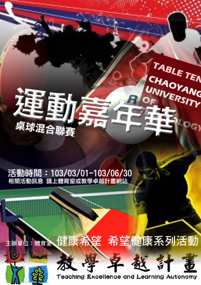 活動宗旨 : 為提升校園運動風氣;促進系際運動交流;增進師生體適能能力;提升桌球運動技術水準;培養團體合作精神,特舉辦本比賽。 主辦單位:朝陽科技大學體育室 承辦單位 :朝陽科技大學 桌球 隊 報名人數: 各系師生採現場報名制(學生須出示學生證) 報名方式:請列印體育室提供之報名表格式,詳細填入各 項資料,並請系主任簽章,於報名期間內將報名表繳交至體育室,始完成報名手續。(如未詳細填妥資料或未附系主任簽章者,視同未完成報名手續,則該系不得參賽。) (四)領隊會議: 民國 103 年 3 月 6 號中午 12 點 30 分於體育館二樓召開。 比賽 日期 : 另行公佈。以不影響學生課業為原則(如夜間、週末等假期)。 參加單位 : 朝陽科技大學各系 師生 ( 教師以專任教師為限 ) 均可報名參 加。 獎勵辦法 : 取前四名頒發獎盃及獎金。 五點賽制(男單、混雙、女單、男雙、男單 ;女生可重複兼單雙打 )。 五點採 5 局 3 勝, 11 球制。 每場雙方各有一次暫停權 循環賽計分法: (1). 勝者得 2 分、敗者得 1 分、未比賽或未賽完者得 0 分,以積分判定名次。 (2). 若兩隊以上(包含二隊)積分相同,以相關各隊間之勝率決定,首先計算場數、然後計算局數、分數,到 全部名次排出為止。(勝率=得分 ÷ 失分) ( 五 ) 未盡事宜則以中華民國桌球協會最新之規則。